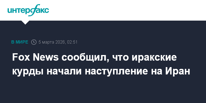 Москва. 5 марта. INTERFAX.RU - Иракские курды начали наступательные действия на территории Ирана на фоне американо-израильской военной операции, сообщает телеканал Fox News, ссылаясь на неназванного американского чиновника.