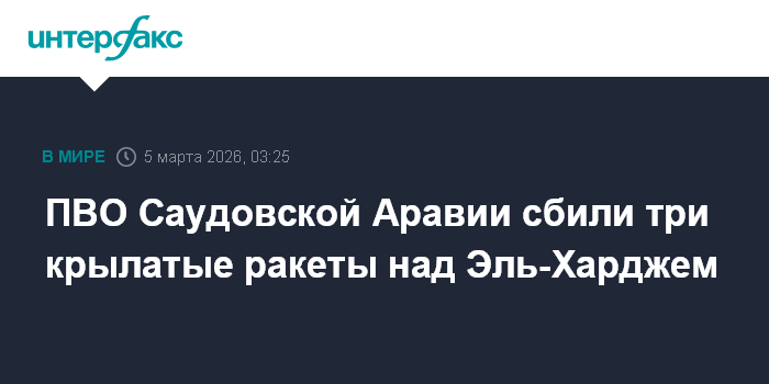 Москва. 5 марта. INTERFAX.RU - Средства ПВО Саудовской Аравии в четверг уничтожили три крылатые ракеты вблизи города Эль-Хардж к юго-востоку от Эр-Рияда, сообщает Министерство обороны королевства.
