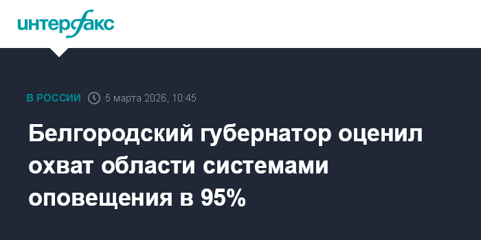 Москва. 5 марта. INTERFAX.RU - Белгородская область обеспечена системами оповещения более чем на 95%, сообщил глава региона Вячеслав Гладков после технической проверки работы системы оповещения.