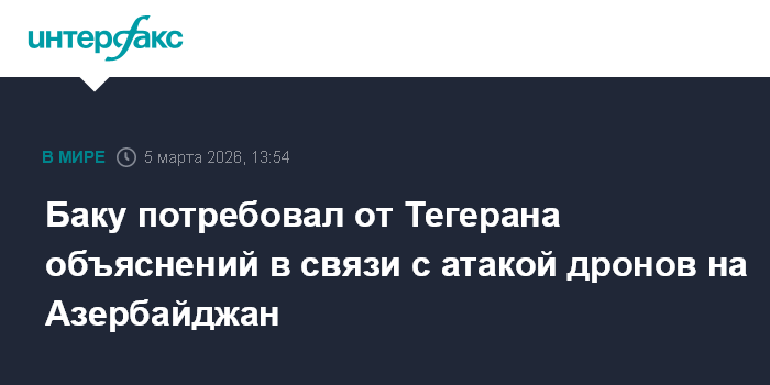 Москва. 5 марта. INTERFAX.RU - Азербайджан требует от Ирана официальных объяснений в кратчайшие сроки по поводу сегодняшней атаки дронов на Нахичеваньскую автономную республику, сообщил глава МИД Азербайджана Джейхун Байрамов в ходе телефонного разговора с узбекистанским коллегой Бахтиёром Саидовым.