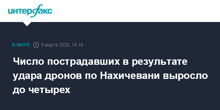 Москва. 5 марта. INTERFAX.RU - В результате атаки Ирана беспилотниками на Нахичеванскую Автономную Республику Азербайджана в медицинские учреждения обратились четыре человека, передают азербайджанские СМИ со ссылкой на больницу Нахичевани.
