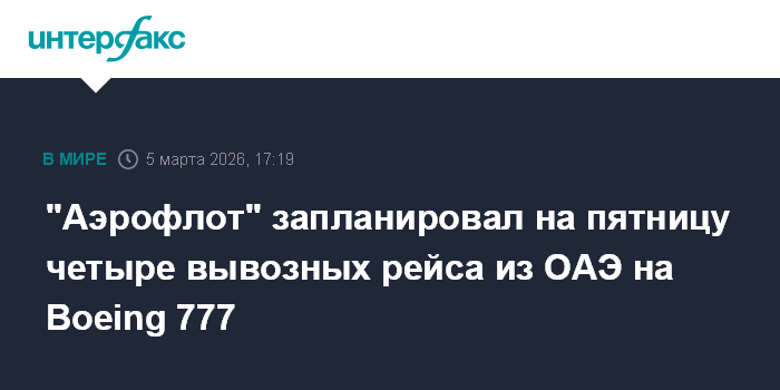 Москва. 5 марта. INTERFAX.RU - "Аэрофлот" запланировал на пятницу четыре рейса из ОАЭ в Москву для вывоза пассажиров по ранее приобретенным билетам, сообщила компания.