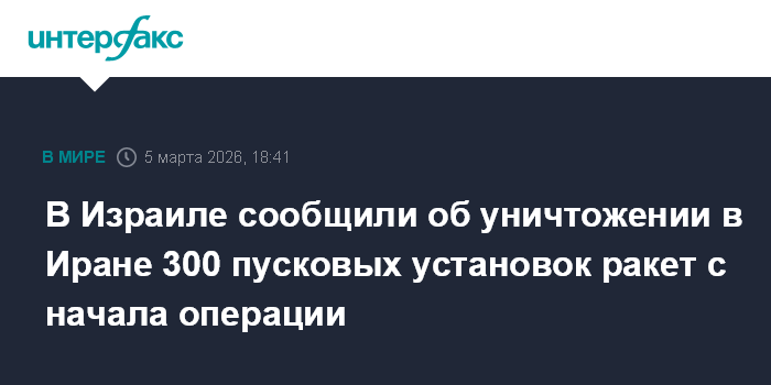 Москва. 5 марта. INTERFAX.RU - Израильские истребители-бомбардировщики уничтожили 300 иранских пусковых установок баллистических ракет с начала военной операции, чтобы максимально уменьшить масштабы обстрелов территории страны, сообщили в четверг израильские ВВС.
