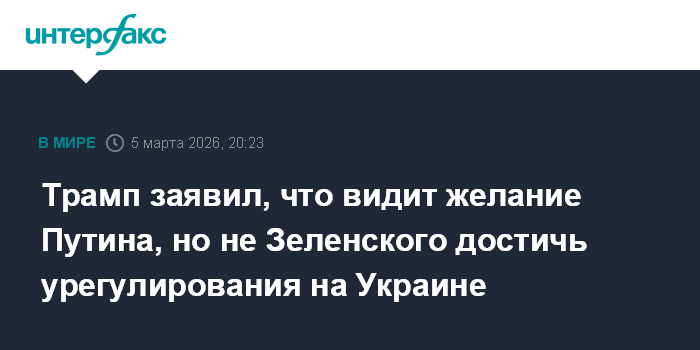Москва. 5 марта. INTERFAX.RU - Президент США Дональд Трамп в четверг заявил, что видит готовность президента России Владимира Путина достичь украинского урегулирования.