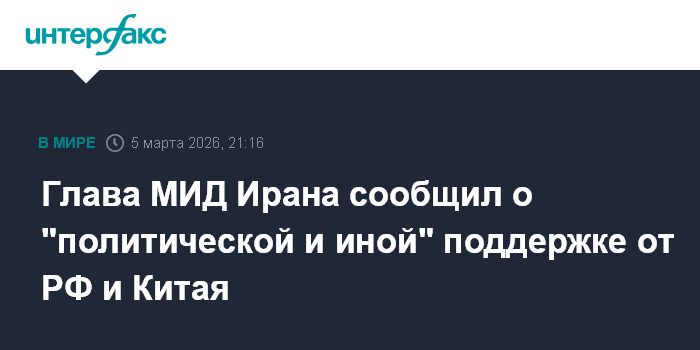 Москва. 5 марта. INTERFAX.RU - Иран в условиях конфликта с США и Израилем получает различную поддержку со стороны России и Китая, заявил глава МИД Ирана Аббас Аракчи в четверг в интервью телеканалу NBC News.
