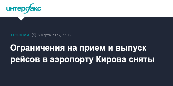 Москва. 5 марта. INTERFAX.RU - Ограничения на прием и выпуск воздушных судов, введенные ранее в аэропорту Кирова, сняты, сообщает пресс-служба Росавиации в четверг вечером в мессенджере Мах.
