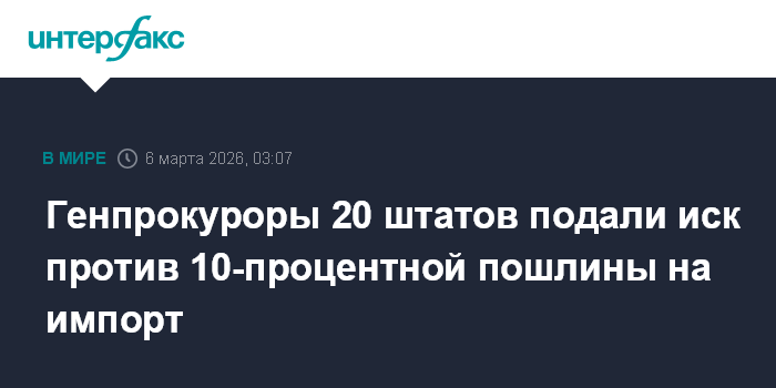 Москва. 6 марта. INTERFAX.RU - Генпрокуроры 20 штатов США подали в суд на президента Дональда Трампа, иск направлен на отмену введенного президентом 10-процентного налога на импорт, сообщает The New York Times.