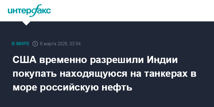 Москва. 6 марта. INTERFAX.RU - Минфин США разрешил Индии временно закупать нефть РФ, находящуюся на танкерах в море, заявил министр финансов Скотт Бессент.