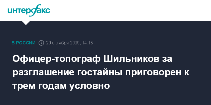 Москва. 29 октября. INTERFAX.RU - Московский окружной военный суд (МОВС) приговорил к 3 годам лишения свободы условно начальника координационной части одной из войсковых частей Военно-топографического управления Генштаба Вооруженных сил РФ, подполковника Эдуарда Шильникова за разглашение гостайны при продаже секретных карт.