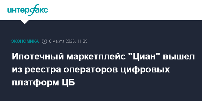 Ипотечный маркетплейс "Циан" вышел из реестра операторов цифровых платформ ЦБ
