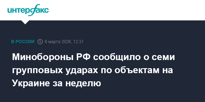 "С 28 февраля по 6 марта в ответ на террористические атаки Украины по гражданским объектам на территории России Вооружёнными силами Российской Федерации нанесены семь групповых ударов, в результате которых поражены объекты энергетики, обеспечивающие работу предприятий военно-промышленного комплекса Украины, транспортная, аэродромная и портовая инфраструктура, используемая в интересах ВСУ", - сказано в сообщении Минобороны.