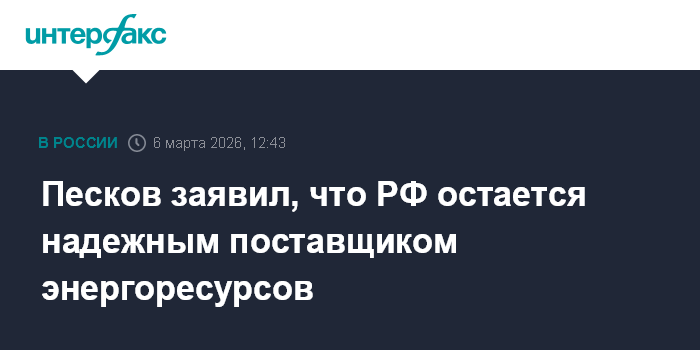"Мы фиксируем существенное повышение спроса на российские энергоресурсы, энергоносители в связи с войной в Иране. Россия была и остается надежным поставщиком как нефти, так и газа, причем как трубного газа, так и сжиженного, и также способна гарантировать постоянство всех тех поставок, которые законтрактованы", - сказал Песков в пятницу.