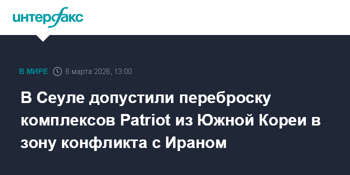 Москва. 6 марта. INTERFAX.RU - Глава южнокорейского МИД Чо Хен заявил, что военные Южной Кореи и США обсуждают возможную передислокацию части развернутых на южнокорейской территории американских зенитных ракетных комплексов (ЗРК) Patriot для операции против Ирана, сообщают в пятницу западные СМИ.