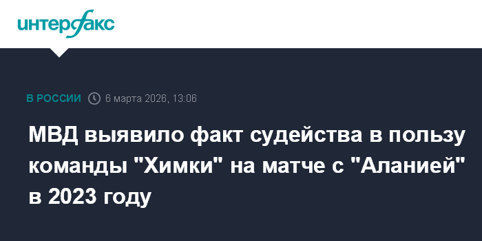 МВД выявило факт судейства в пользу команды "Химки" на матче с "Аланией" в 2023 году