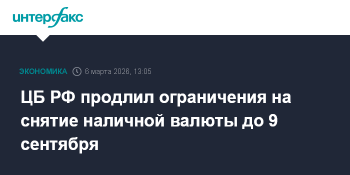Москва. 6 марта. INTERFAX.RU - Банк России продлил еще на полгода, до 9 сентября 2026 года, ограничения на снятие наличной иностранной валюты, говорится в сообщении регулятора.