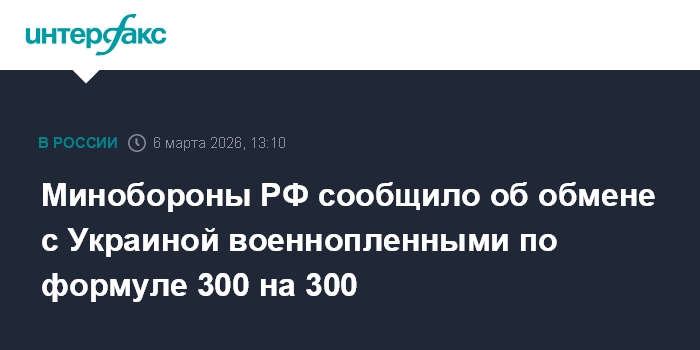 Москва. 6 марта. INTERFAX.RU - Россия и Украина в пятницу провели обмен военнопленными по формуле 300 на 300, посредничество оказали ОАЭ и США, сообщили в Минобороны РФ.