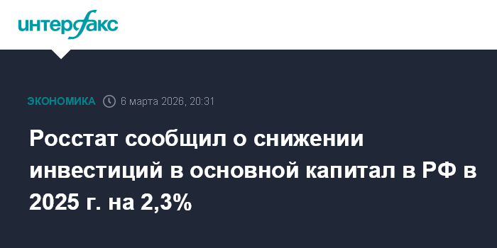 В целом за 2025 год инвестиции в основной капитал, по оценке Росстата, снизились на 2,3% после роста на 8,4% в 2024 году, роста на 9,8% в 2023 году, роста на 6,7% в 2022 году, роста на 8,6% в 2021 году, снижения на 0,1% в 2020 году.