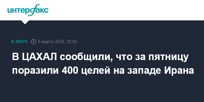 Москва. 6 марта. INTERFAX.RU - Израильские военные в пятницу нанесли удары по более чем 400 целям на западе Ирана, сообщает The Times of Israel со ссылкой на Армию обороны Израиля (ЦАХАЛ).