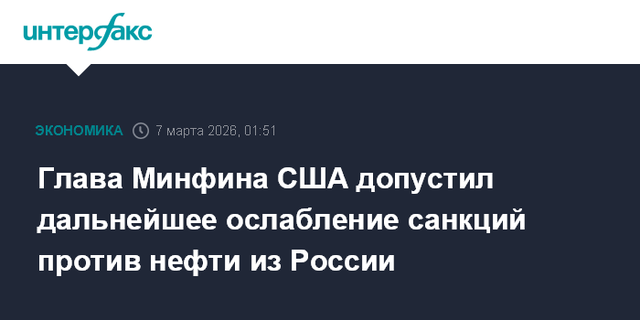 Москва. 7 марта. INTERFAX.RU - Для снижения напряженности на нефтяном рынке Вашингтон может принять решение о дальнейшем ослаблении санкций против российской нефти, заявил глава Минфина США Скотт Бессент.