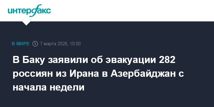 Москва. 7 марта. INTERFAX.RU - Из Ирана в Азербайджан со 2 марта эвакуированы 282 гражданина России, сообщили в субботу азербайджанские СМИ.