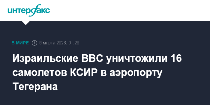 Москва. 8 марта. INTERFAX.RU - Израильские ВВС в субботу уничтожили 16 самолетов Корпуса стражей исламской революции (КСИР), которые находились в тегеранском международном аэропорту Мехрабад, сообщила Армия обороны Израиля (ЦАХАЛ).