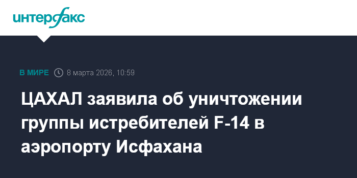 Москва. 8 марта. INTERFAX.RU - Израильские ВВС в ходе авиаударов уничтожили несколько иранских истребителей F-14, находившихся в аэропорту Исфахана, сообщила Армия обороны Израиля (ЦАХАЛ).