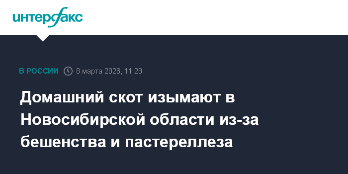 Москва. 8 марта. INTERFAX.RU - В нескольких районах Новосибирской области в личных подсобных хозяйствах из-за опасности распространения бешенства и пастереллеза производится изъятие домашнего скота, сообщили "Интерфаксу" в воскресенье в пресс-службе министерства сельского хозяйства региона.