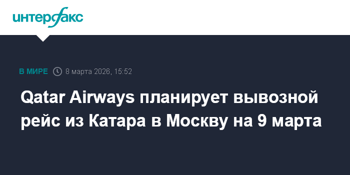 Москва. 8 марта. INTERFAX.RU - Авиакомпания Qatar Airways на 9 марта планирует вывозной рейс в Москву для застрявших пассажиров, сообщает в воскресенье посольство РФ в Катаре.