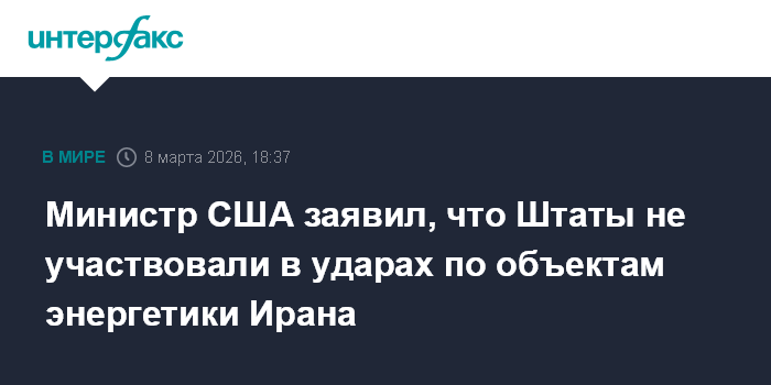 Москва. 8 марта. INTERFAX.RU - ВС США не принимали участие в израильских ударах по объектам энергетики в районе Тегерана, заявил в воскресенье американский министр энергетики Крис Райт.