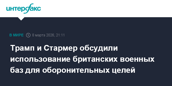 Москва. 8 марта. INTERFAX.RU - Лидеры США и Великобритании Дональд Трамп и Кир Стармер обсудили использование баз Королевских военно-воздушных сил (RAF) на Ближнем Востоке для коллективной обороны, сообщается на сайте правительства Великобритании.