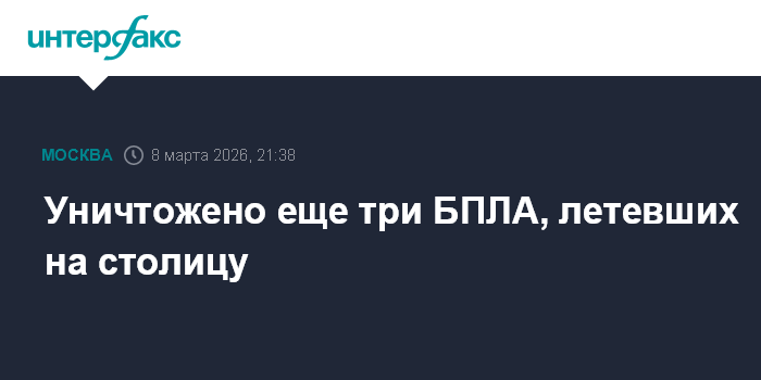 Москва. 8 марта. INTERFAX.RU - Средствами ПВО ликвидировано еще три беспилотника, пытавшихся атаковать Москву, сообщил в воскресенье вечером мэр столицы Сергей Собянин.