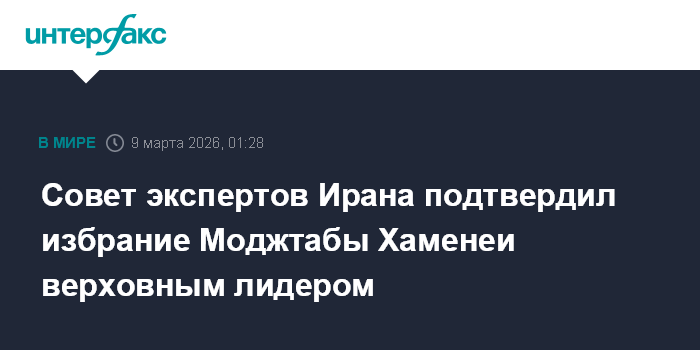 Москва. 9 марта. INTERFAX.RU - Совет экспертов Ирана подтвердил, что новым верховным лидером Исламской Республики избран Моджтаба Хаменеи - сын погибшего аятоллы Али Хаменеи.