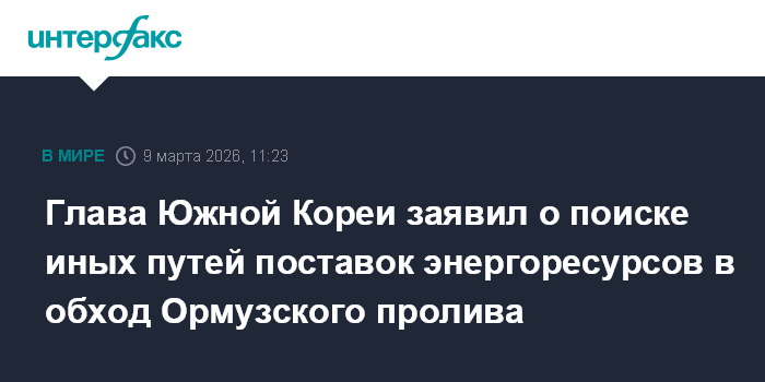 Москва. 9 марта. INTERFAX.RU - Сеул в связи с конфликтом на Ближнем Востоке займется поиском альтернативных маршрутов поставок энергоресурсов, не идущих через Ормузский пролив, заявил президент Южной Кореи Ли Чжэ Мен.