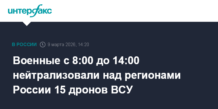 Москва. 9 марта. INTERFAX.RU - Российские военные в понедельник с 8:00 до 14:00 по московскому времени перехватили и уничтожили 15 украинских беспилотников над регионами РФ, сообщило Минобороны России.