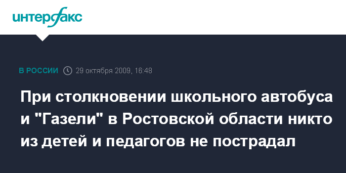 Москва. 29 октября. INTERFAX.RU - В столкновении школьного автобуса и "Газели" на трассе в Ростовской области пострадавших среди детей и взрослых нет. "Никто из школьников и сопровождавших их взрослых не пострадал во время столкновения школьного автобуса и Газели. Попутным транспортом школьники отправлены к месту назначения", - сообщили агентству "Интерфакс-Юг" в четверг в пресс-службе Южного регионального центра (ЮРЦ) МЧС РФ.