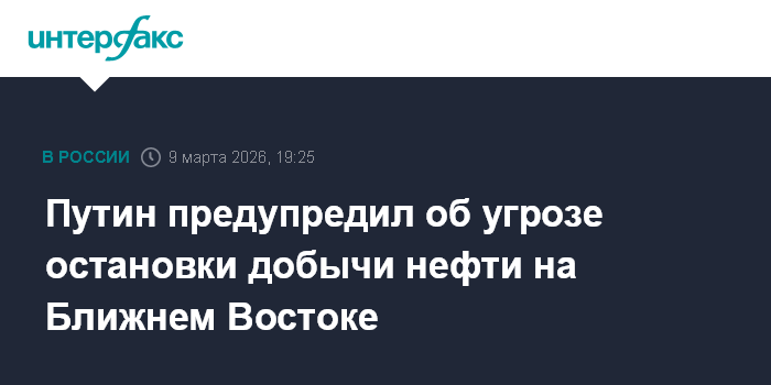 Москва. 9 марта. INTERFAX.RU - Добыча нефти в ряде стран Ближнего Востока рискует полностью остановиться уже в ближайший месяц из-за невозможности ее экспорта ввиду блокады Ормузского пролива, считает президент РФ Владимир Путин.