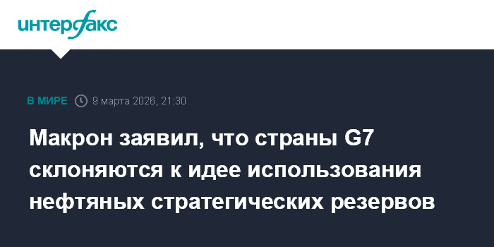 Москва. 9 марта. INTERFAX.RU - Страны "Группы семи" постепенно начинают поддерживать идею об использовании нефти из своих стратегических резервов на фоне ситуации на Ближнем Востоке, заявил в понедельник президент Франции Эммануэль Макрон.