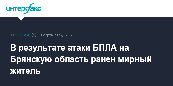 Москва. 10 марта. INTERFAX.RU - В результате атаки БПЛА на автомобиль в Брянской области мирный житель получил ранения, сообщил губернатор региона Александр Богомаз.