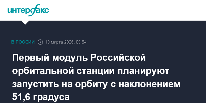 Москва. 10 марта. INTERFAX.RU - Запуск первого модуля Российской орбитальной станции (РОС) планируется в 2028 году, его выведут на орбиту с наклонением 51,6 градуса, заявил глава "Роскосмоса" Дмитрий Баканов в интервью журналу "Разведчик".