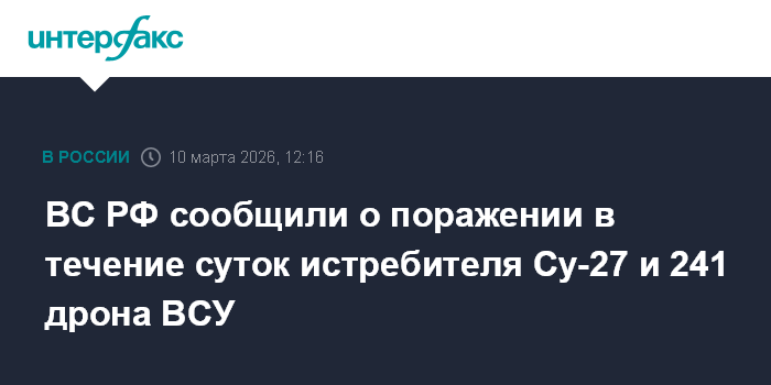 Москва. 10 марта. INTERFAX.RU - Российские военные сообщили, что в течение суток сбили украинский самолет Су-27, восемь авиабомб и 241 беспилотник.
