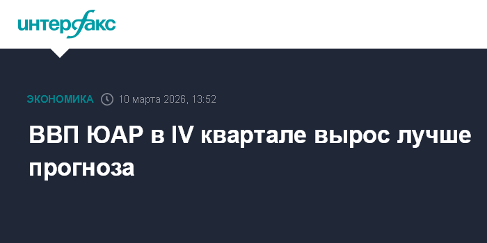 Москва. 10 марта. INTERFAX.RU - Экономика ЮАР в четвертом квартале 2025 года выросла на 0,4% в квартальном исчислении, сообщило статуправление страны.