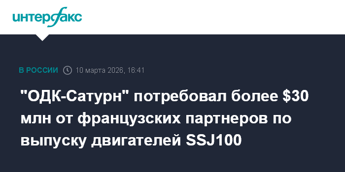 Москва. 10 марта. INTERFAX.RU - ПАО "ОДК-Сатурн" (входит в ОДК "Ростеха") подало иск к французским Safran, Safran Aircraft Engines и Snecma Participations о взыскании задолженности по контрактам в размере $30,4 млн и 461,1 тысячи евро.