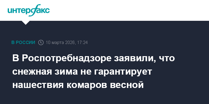Москва. 10 марта. INTERFAX.RU - Снежная и холодная зима не гарантирует "всплеска" комаров и клещей, а обитающие на территории России комары, как правило, не представляют высоких эпидемиологических рисков и не являются переносчиками опасных тропических лихорадок, заявили в Роспотребнадзоре.