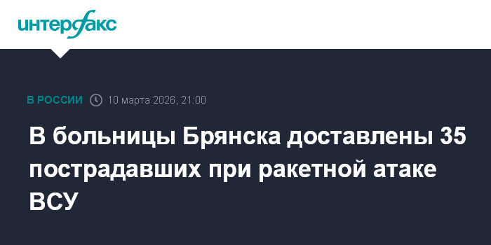 Москва. 10 марта. INTERFAX.RU - После ракетной атаки ВСУ в больницы Брянска доставлены 35 пострадавших; часть из них - в тяжелом состоянии, сообщили помощник главы Минздрава РФ Алексей Кузнецов.