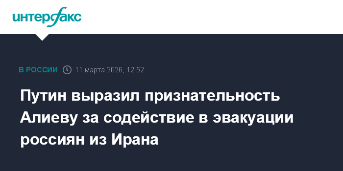 Путин выразил Алиеву "признательность за эффективное содействие в организации эвакуации из Ирана российских граждан, а также в обеспечении доставки из России гуманитарной помощи иранскому народу через азербайджанскую территорию", говорится в сообщении пресс-службы Кремля.