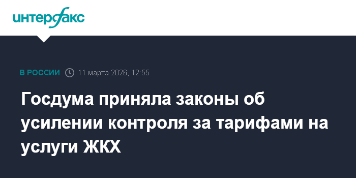 Москва. 11 марта. INTERFAX.RU - Госдума на заседании в среду приняла во втором и в третьем, окончательном, чтениях законы, направленные на усиление контроля в сфере регулирования тарифов на услуги ЖКХ.