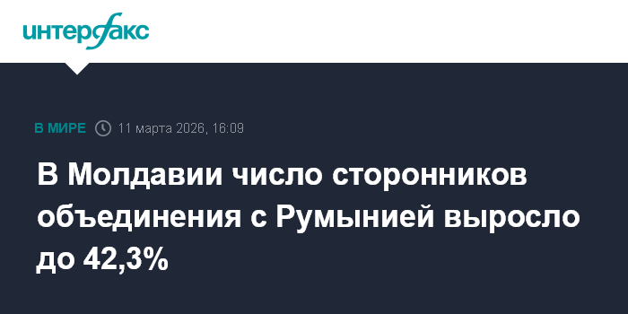 Москва. 11 марта. INTERFAX.RU - В Молдавии с начала года выросло число сторонников объединения с Румынией, показал опрос компании iData. Опрос проводился 23 февраля - 6 марта среди 1035 человек. Погрешность - 2,9%.