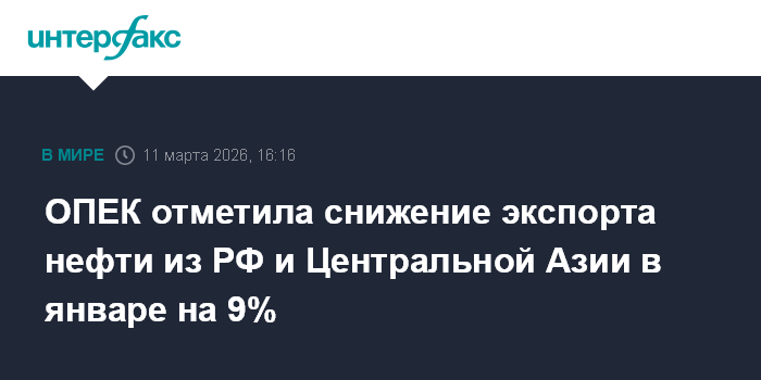 Москва. 11 марта. INTERFAX.RU - Общий объем экспорта нефти из России и стран Центральной Азии в январе в среднем составил 5,8 млн баррелей в сутки, что на 588 тыс. б/с, или на 9% меньше, чем в декабре прошлого года, сообщается в ежемесячном отчете ОПЕК.