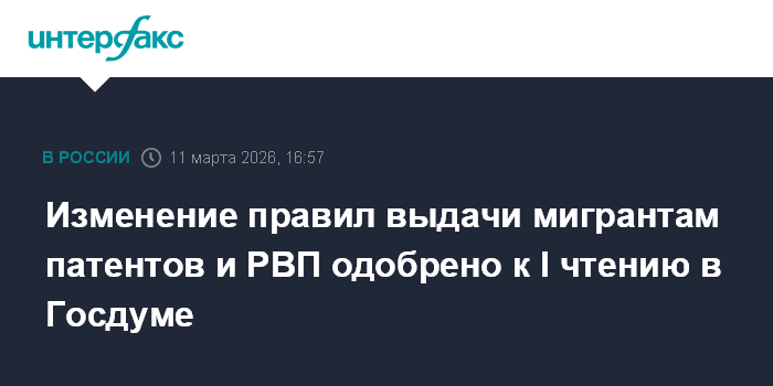 Москва. 11 марта. INTERFAX.RU - Комитет Госдумы по делам СНГ рекомендовал принять в первом чтении законопроект № 1158407-8 об изменении условий выдачи патентов и разрешений на временное пребывание (РВП) для мигрантов.