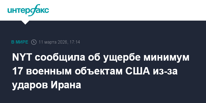 Москва. 11 марта. INTERFAX.RU - Удары Ирана ракетами и беспилотниками привели к повреждениям, как минимум, на 17 американских военных базах и других объектах на Ближнем Востоке, сообщила The New York Times со ссылкой на спутниковые снимки и видеозаписи, подлинность которых удалось установить.